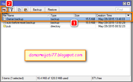 Konfigurasi dalam routerboard dapat dibackup dan disimpan untuk digunakan kembali. Ada 2 macam cara backup di routerboard, yaitu :